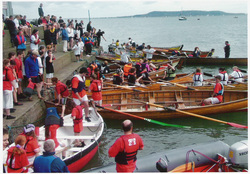 The cox should make sure that the oars and spurs are all present and correct and that the oars are in order and suitably positioned. Once all is well the cox should ship the rudder before calling the crew aboard one by one.