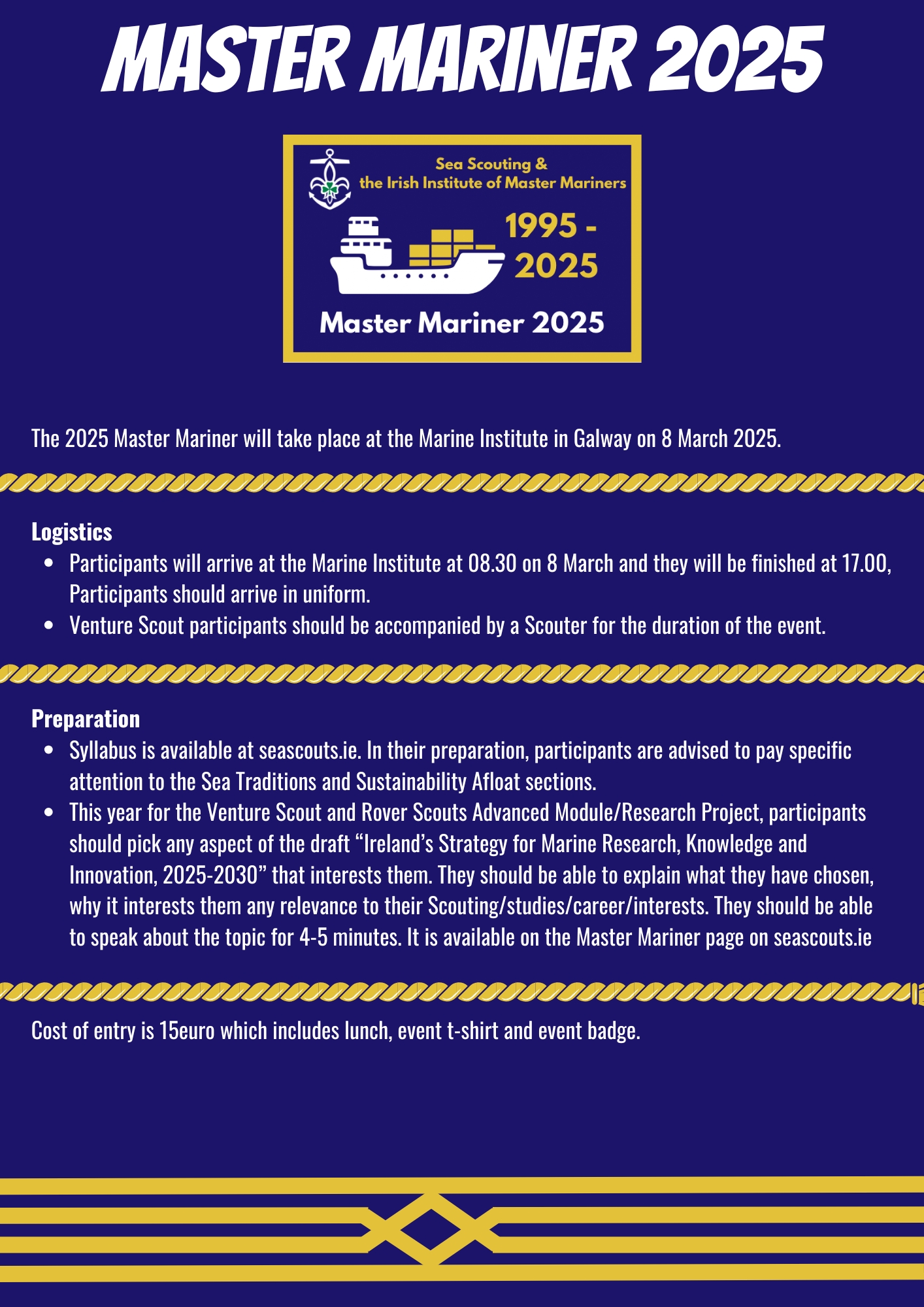 Master Mariner 2025 First information pack The 2025 Master Mariner will take place at the Marine Institute in Galway on 8&9 March 2025. Logistics Participants will arrive at the Marine Institute a Jan 14, 2025
